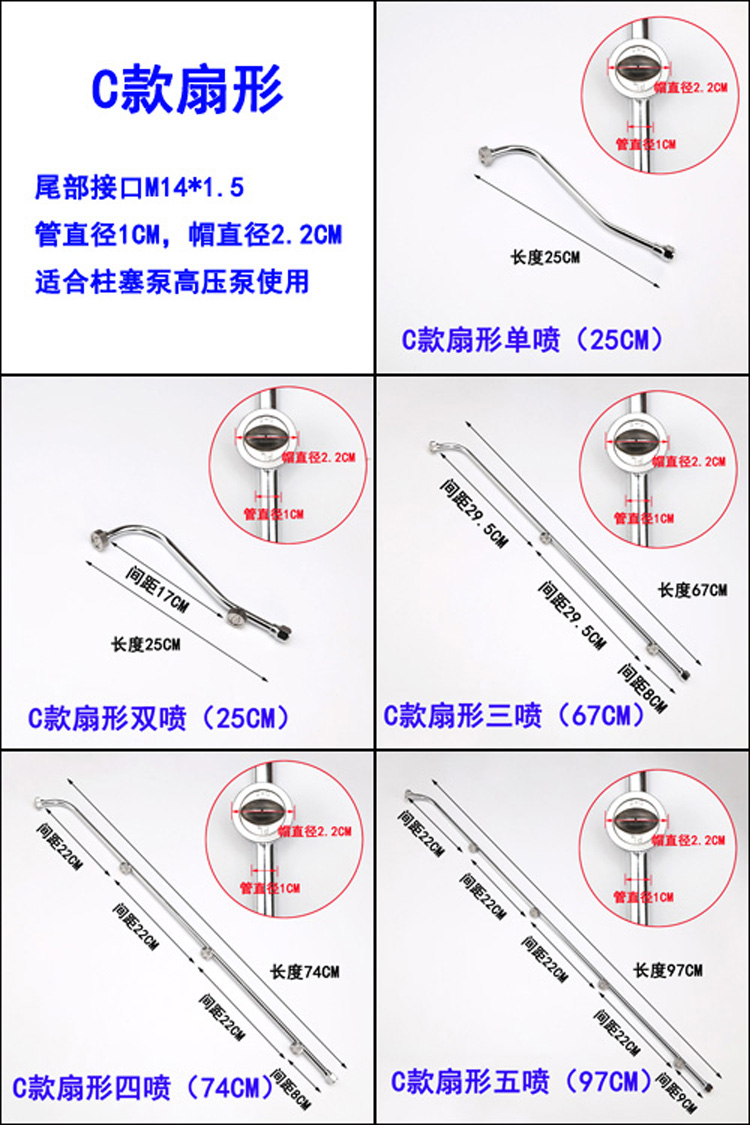 C款;规格1-5头,加厚型。管直径1.0CM,喷帽直径2.2CM。尾部内螺纹接口。