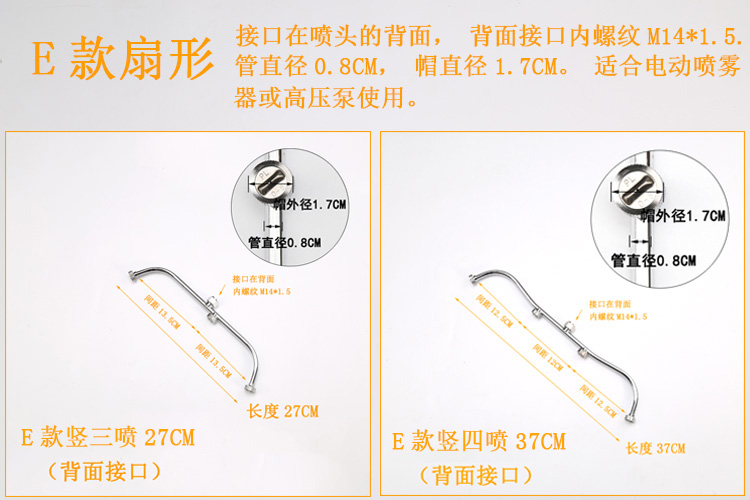 E款:竖三四喷。管直径0.8CM,喷帽直径1.7CM。喷嘴的背面内 螺纹接口