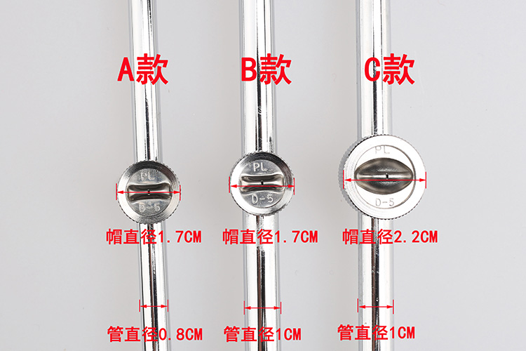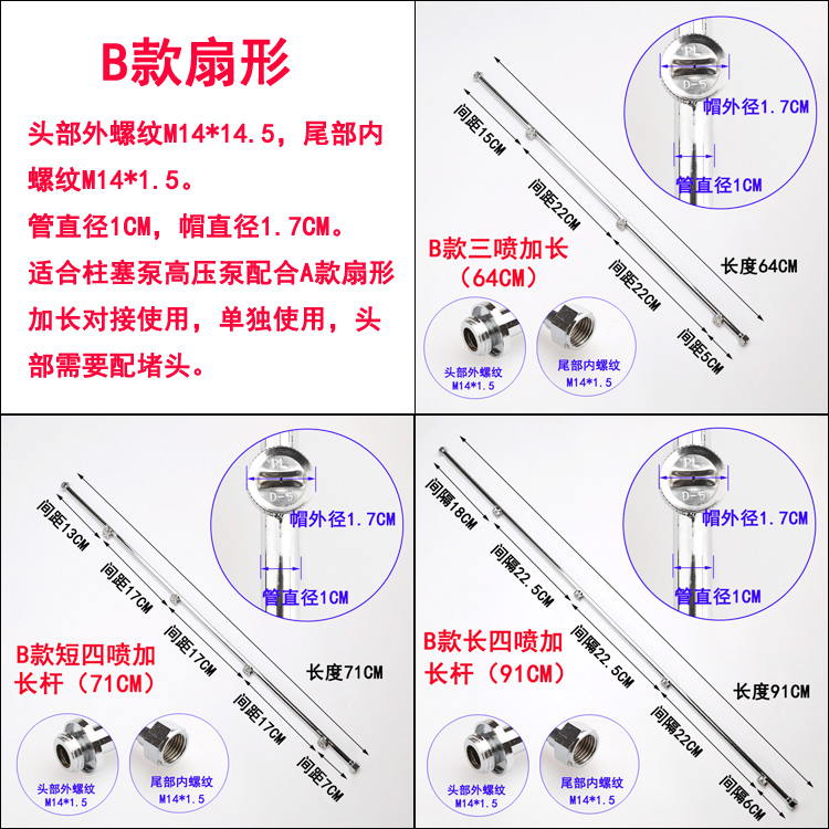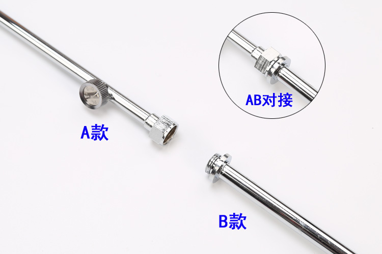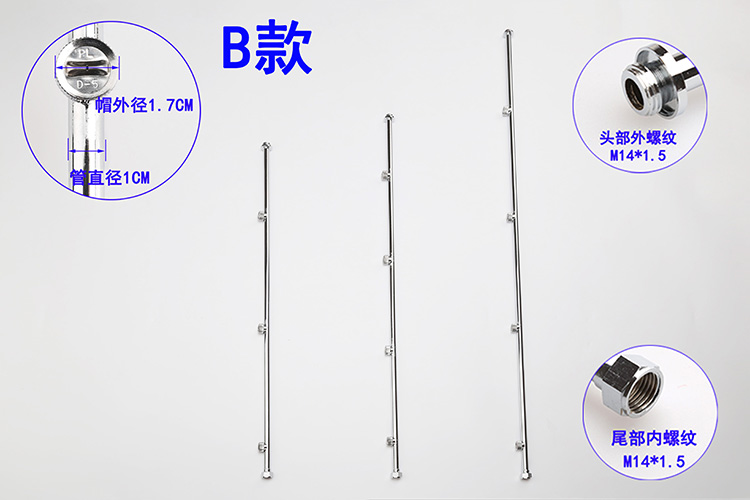 B款:加长杆3-4头,管直径1.0CM,喷头直径1.7CM。头部外螺 纹,尾部内螺纹。可以搭配A款使用,或B款对接无限加 长。对接后喷头太长,在使用过程中建议用棒子固定。 (如果想要单独使用,请搭配堵头。本店有售)