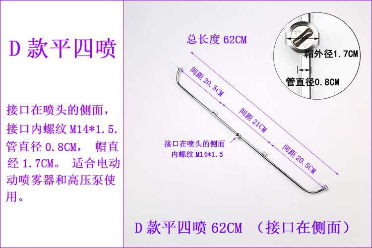 D款:平四喷。管直径0.8CM,喷帽直径1.7CM。侧面内螺纹接口