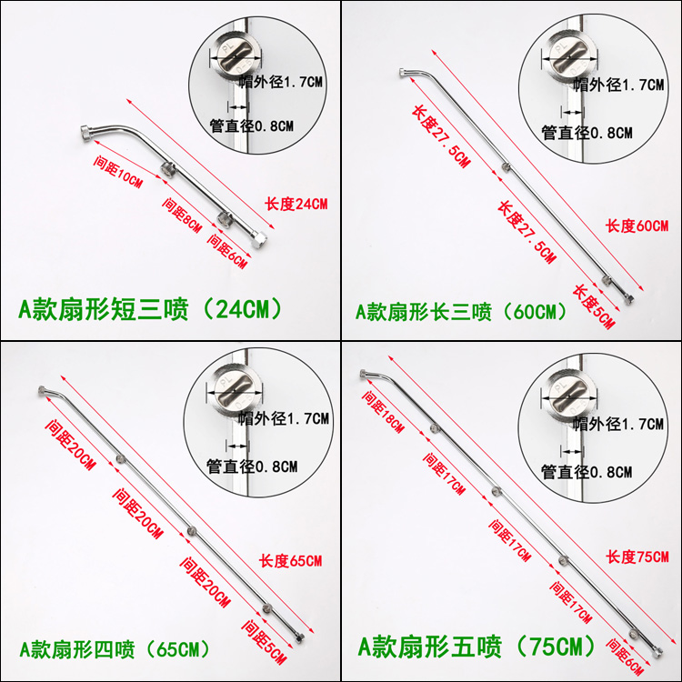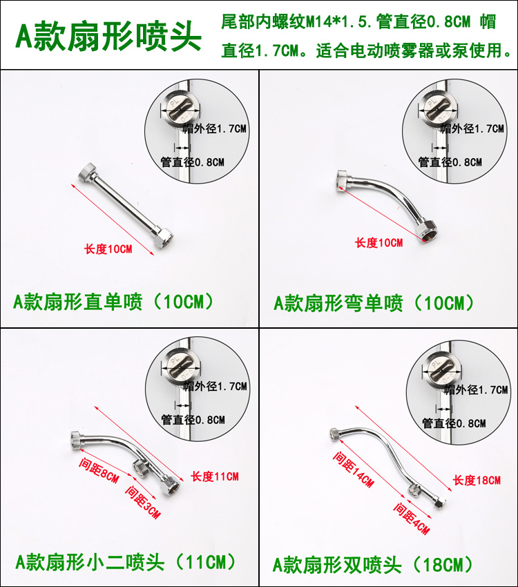 A款:规格1-5头,管直径0.8CM,喷帽直径1.7CM。尾部内螺纹接口。